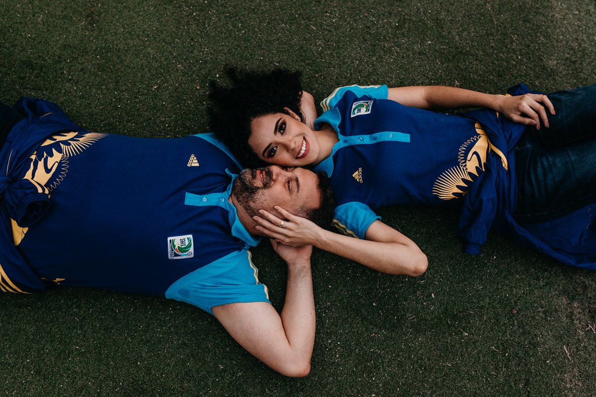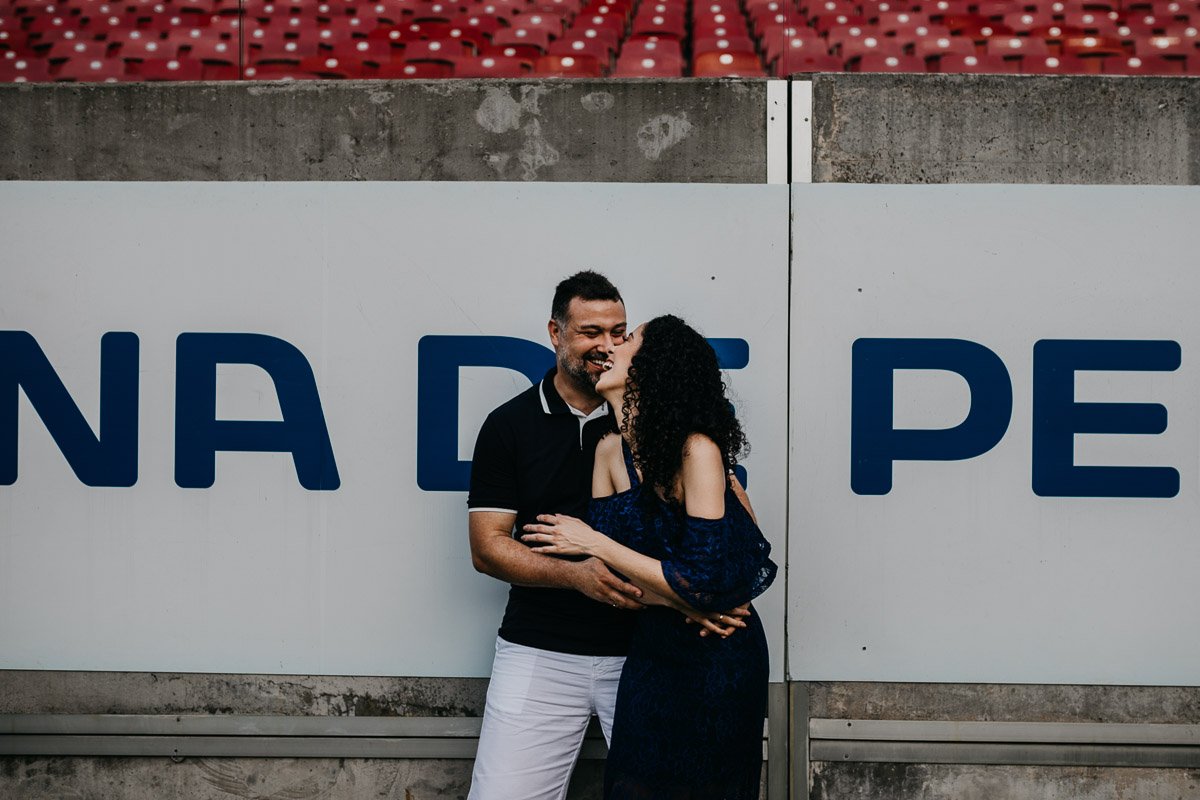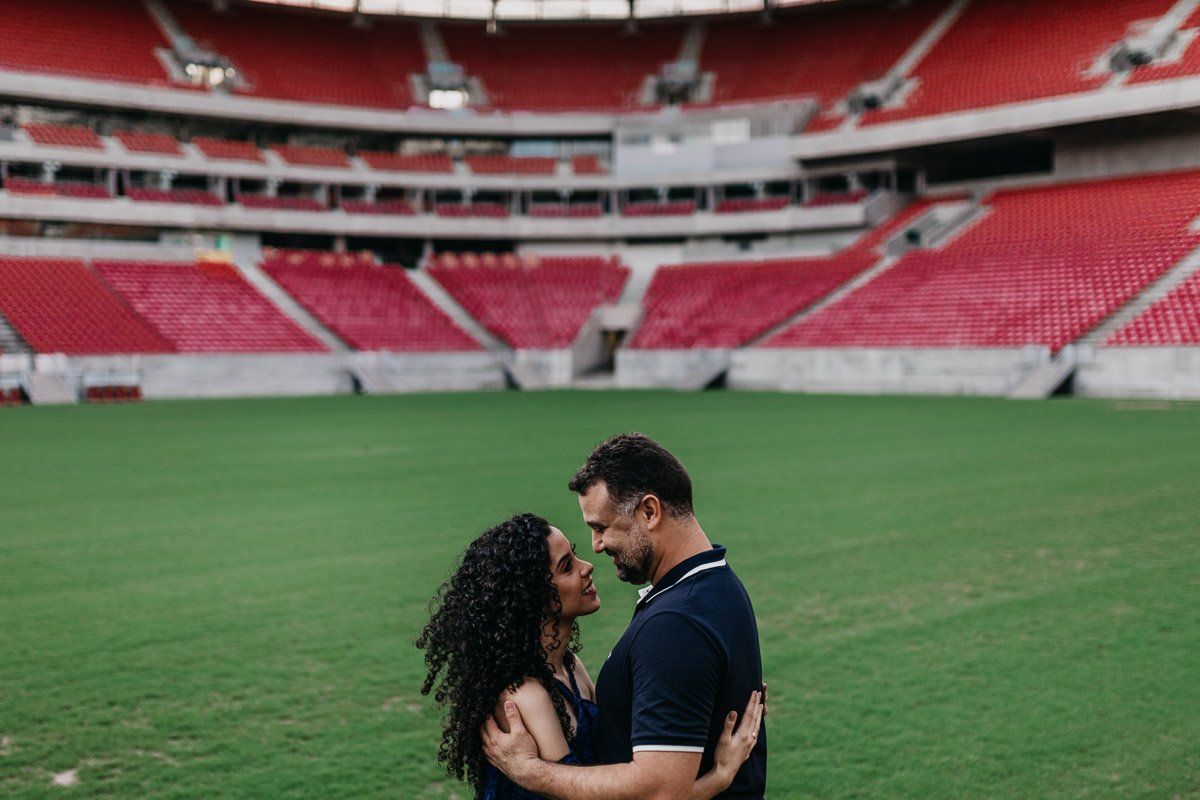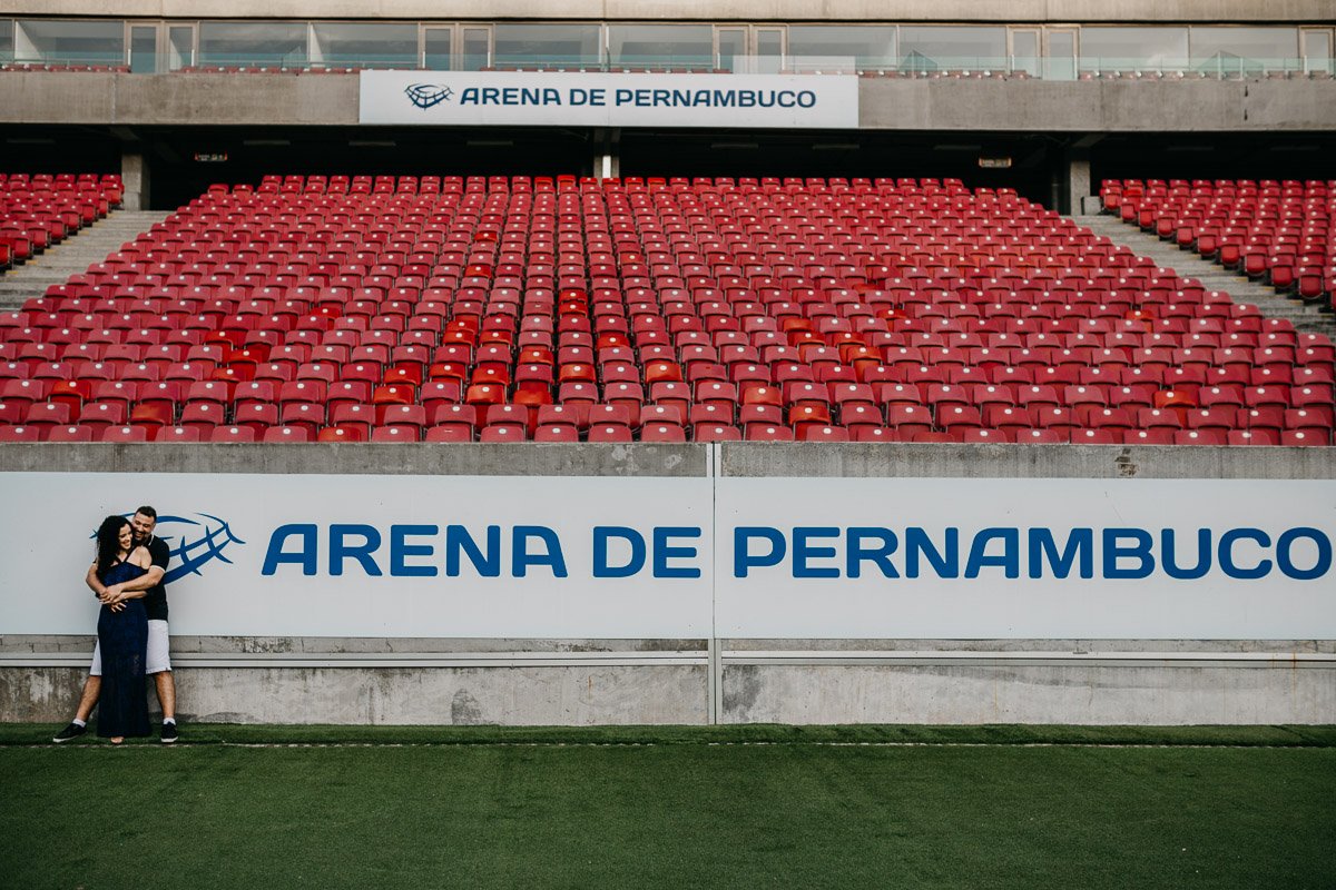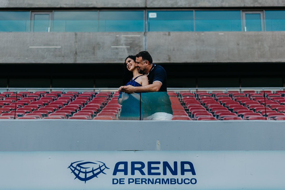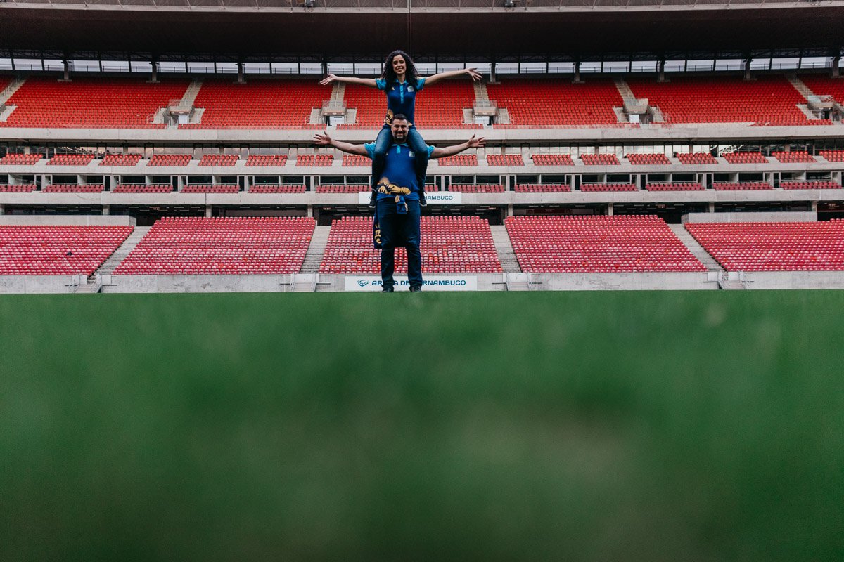 - Nos conhecemos em 2013, na Arena Pernambuco, quando fazíamos trabalho voluntário, durante a Copa das Confederações (por isso a escolha do local das fotos... ainda guardamos nossos uniformes!). A noiva foi voluntária na área de atendimento ao público, enquanto ele auxiliava a equipe de TI. Mas, por alguma razão, sentaram perto um do outro num intervalo do último dia de trabalho. O noivo, forrozeiro, achou que estava com sorte pois naquele dia era véspera de São João. Ele só não contava que a noiva era fã mesmo de Maroon 5... Porém, no fim da festa de despedida dos voluntários, ainda contando com a sorte, não é que ele conseguiu dançar um forró com ela? E, neste momento, pensou: é com essa que quero me casar!
