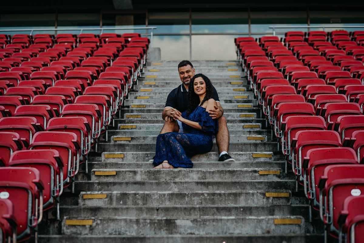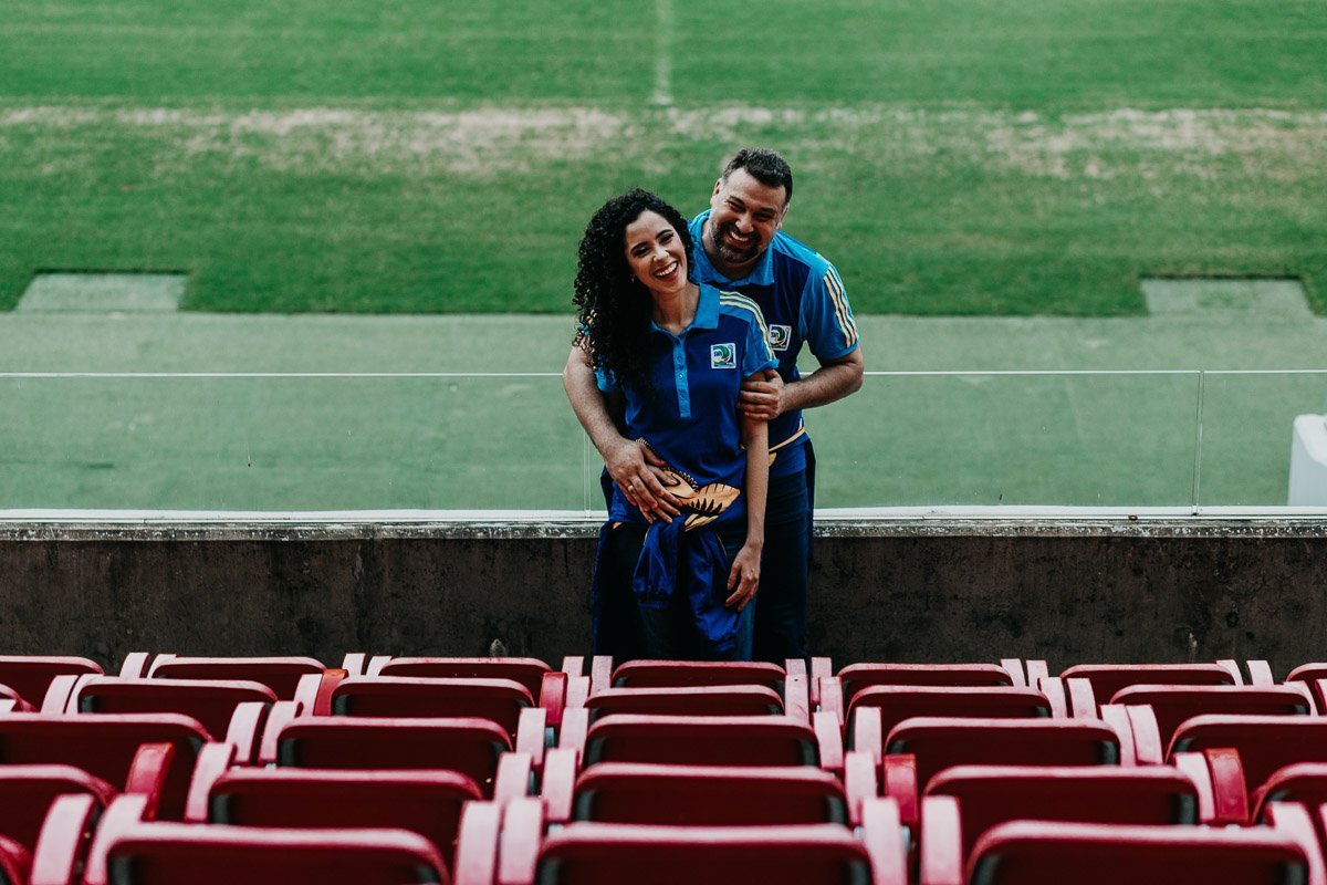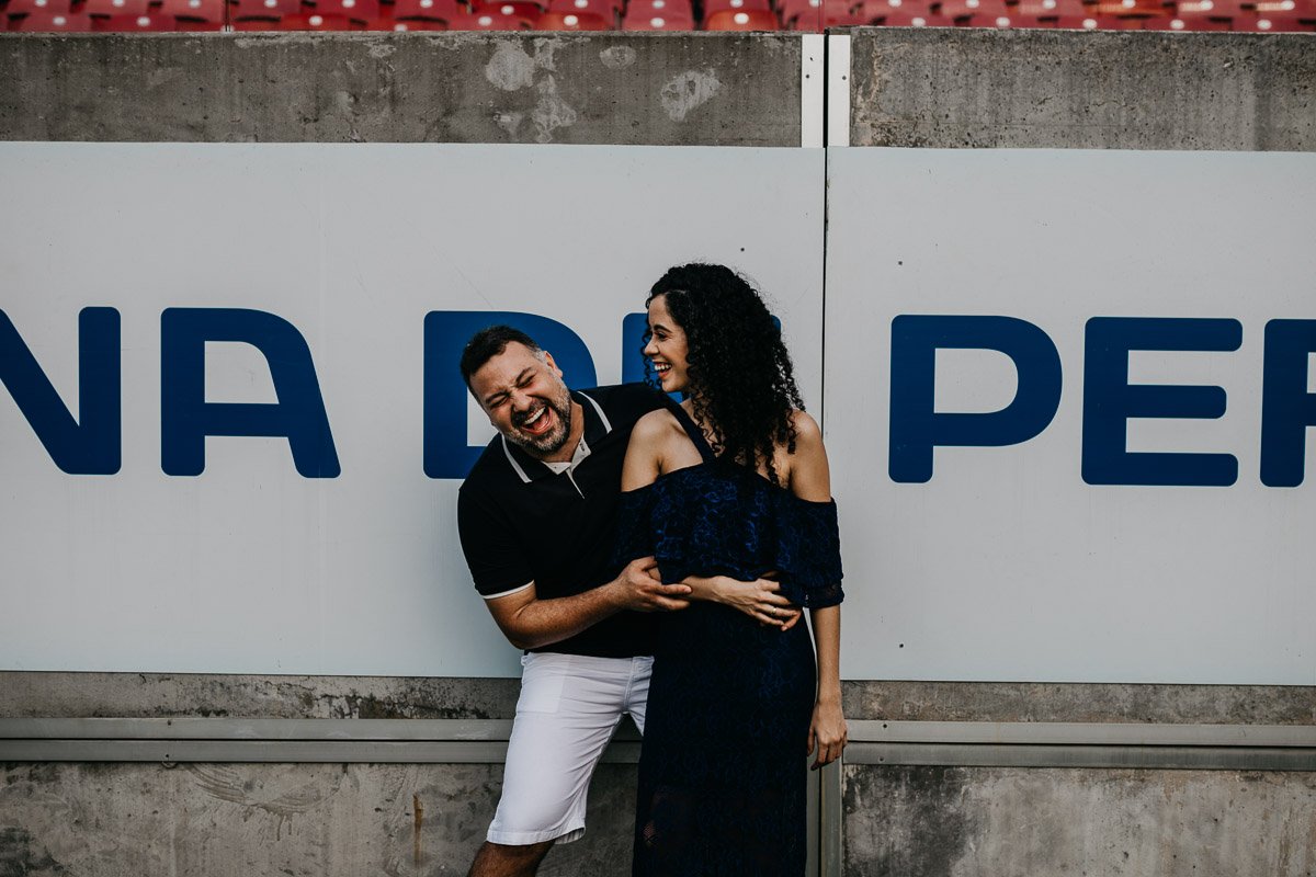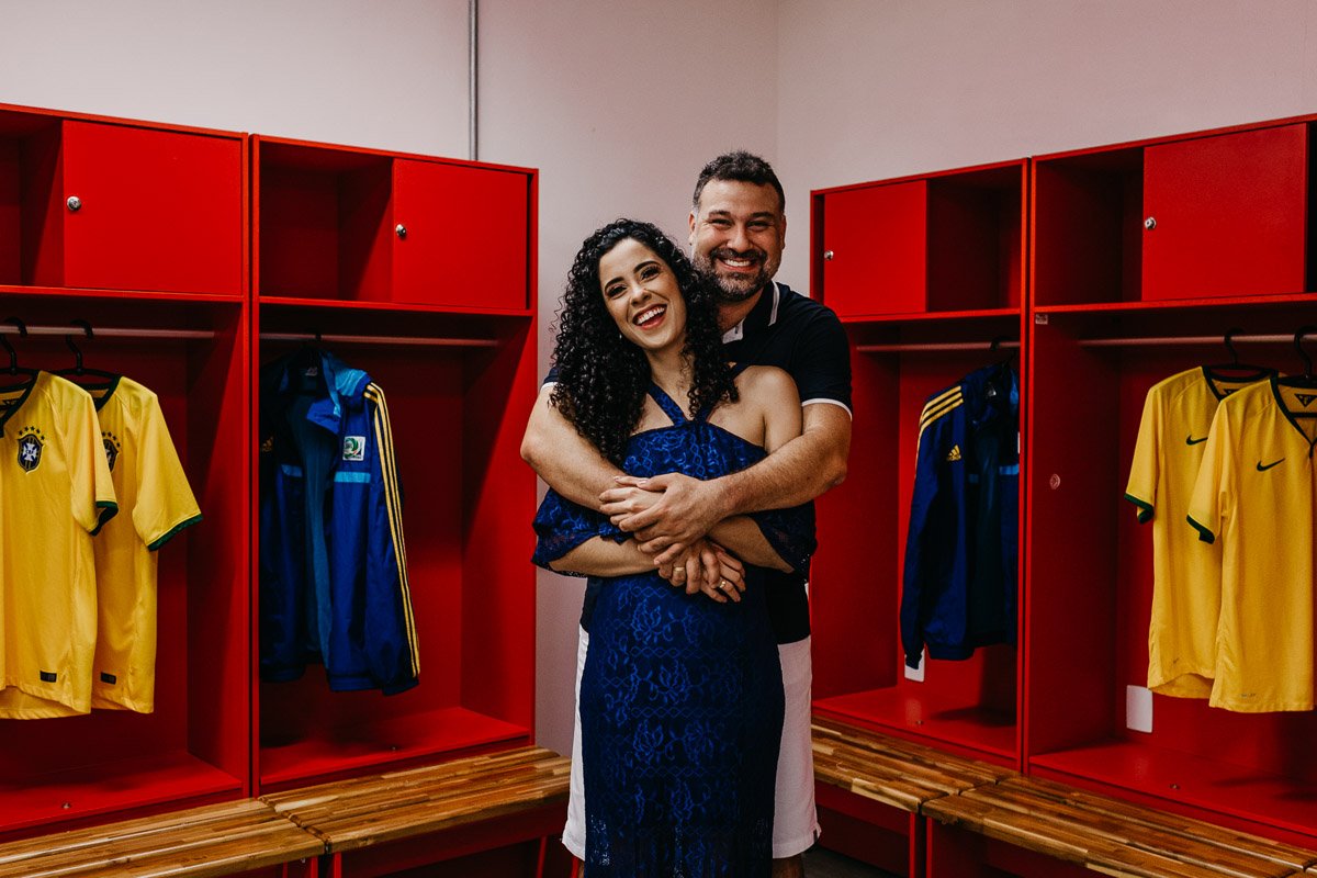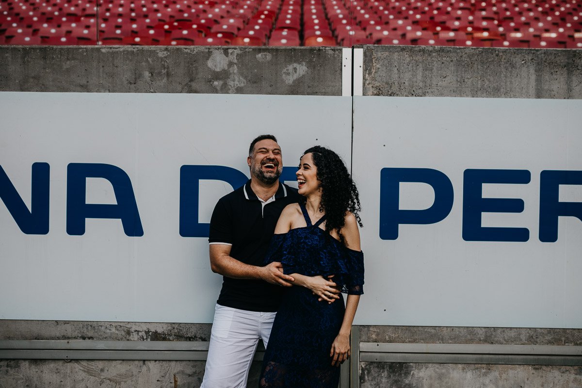 - Nos conhecemos em 2013, na Arena Pernambuco, quando fazíamos trabalho voluntário, durante a Copa das Confederações (por isso a escolha do local das fotos... ainda guardamos nossos uniformes!). A noiva foi voluntária na área de atendimento ao público, enquanto ele auxiliava a equipe de TI. Mas, por alguma razão, sentaram perto um do outro num intervalo do último dia de trabalho. O noivo, forrozeiro, achou que estava com sorte pois naquele dia era véspera de São João. Ele só não contava que a noiva era fã mesmo de Maroon 5... Porém, no fim da festa de despedida dos voluntários, ainda contando com a sorte, não é que ele conseguiu dançar um forró com ela? E, neste momento, pensou: é com essa que quero me casar!