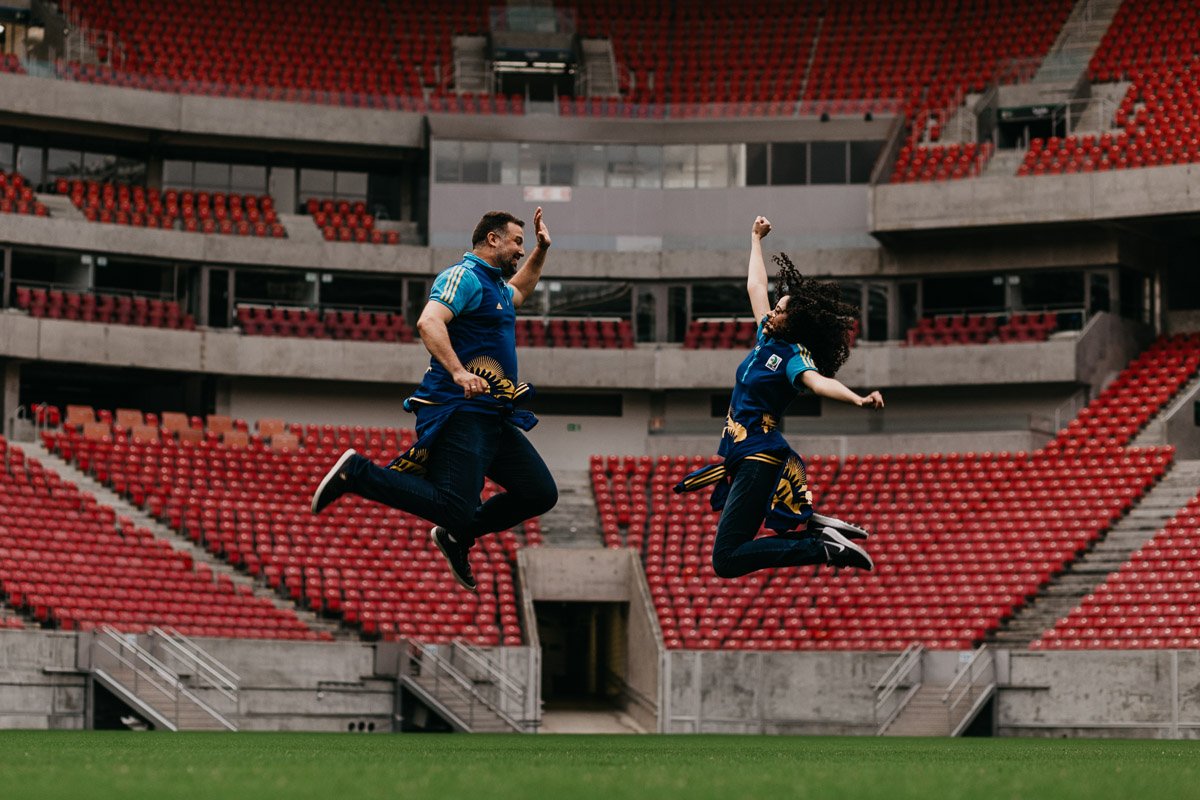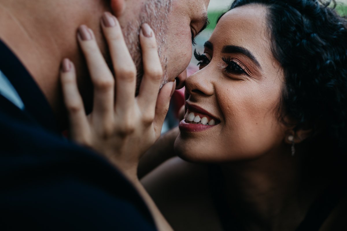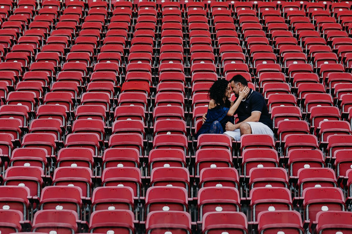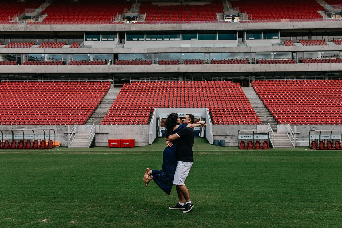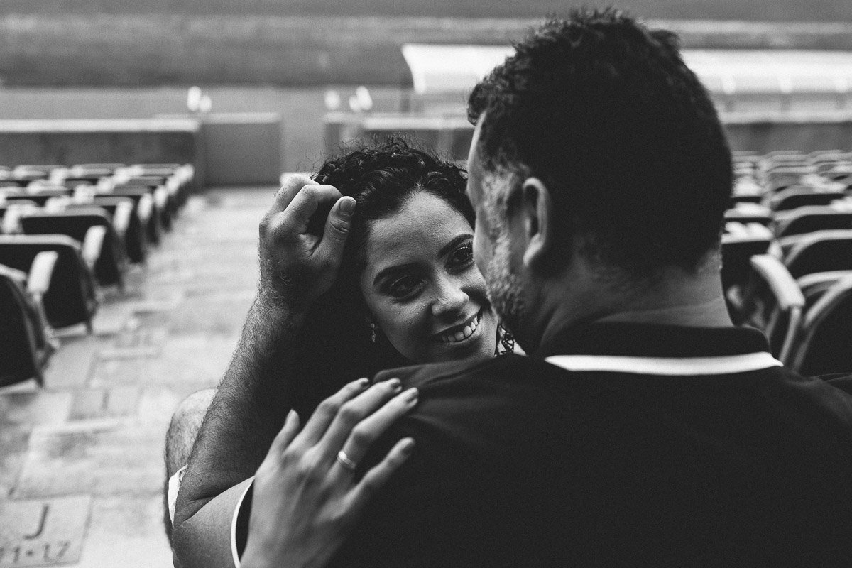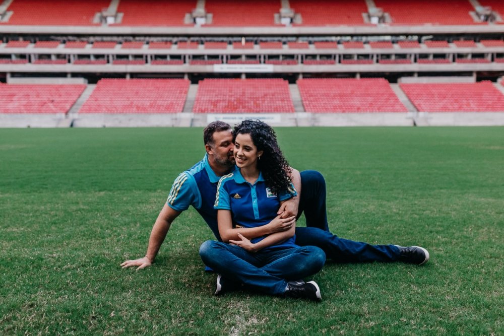 - Nos conhecemos em 2013, na Arena Pernambuco, quando fazíamos trabalho voluntário, durante a Copa das Confederações (por isso a escolha do local das fotos... ainda guardamos nossos uniformes!). A noiva foi voluntária na área de atendimento ao público, enquanto ele auxiliava a equipe de TI. Mas, por alguma razão, sentaram perto um do outro num intervalo do último dia de trabalho. O noivo, forrozeiro, achou que estava com sorte pois naquele dia era véspera de São João. Ele só não contava que a noiva era fã mesmo de Maroon 5... Porém, no fim da festa de despedida dos voluntários, ainda contando com a sorte, não é que ele conseguiu dançar um forró com ela? E, neste momento, pensou: é com essa que quero me casar!